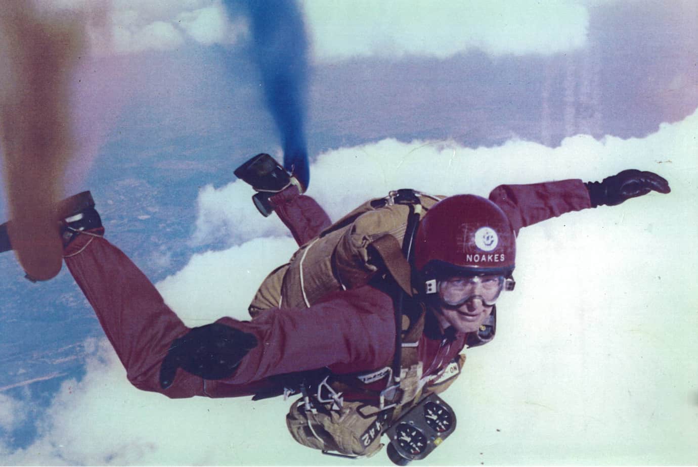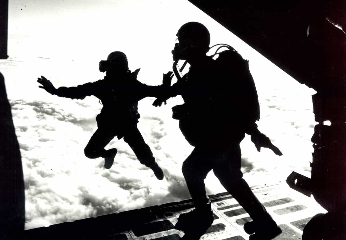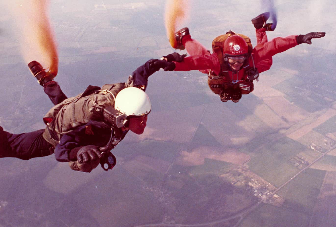 In 1973 the RAF Falcons asked John Noakes if he would like to make a five mile free fall jump. He successfully completed the jump on 15th May 1973 and achieved three “firsts” in the process: the first civilian in Britain to make a five mile high free fall; the first outsider to join the Flying Falcons; and the first television presenter in Britain to talk to a camera while falling through space. Needless to say, the jump got John into the Guinness Book of Records. His later jumps set the civilian freefall altitude record which stood for a number of years.