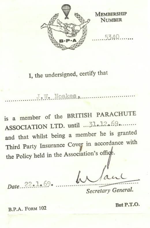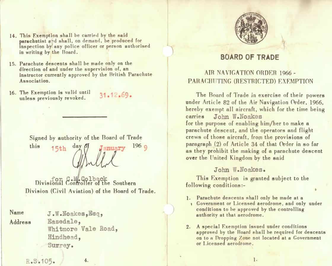 John Noakes of BBC TV’s “Blue Peter” programme carried out a number of parachute jumps in the late 1960s and early 1970s. He was kind enough to provide the British Skydiving Archive with the below information which reflects his wide ranging achievements over his short time in the sport. The British Skydiving Archive project extends grateful thanks to John and his wife Vicky for their help and co-operation.