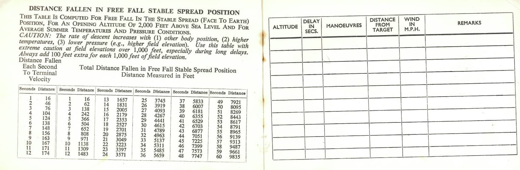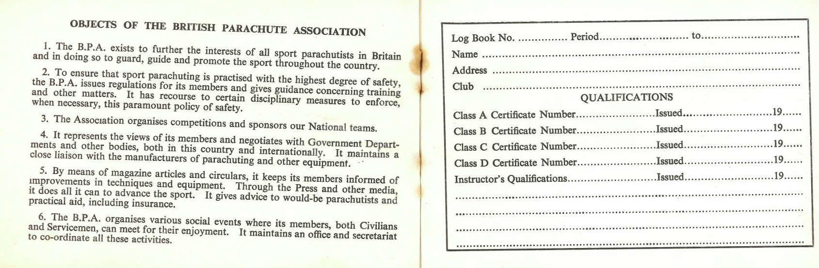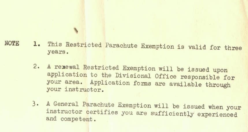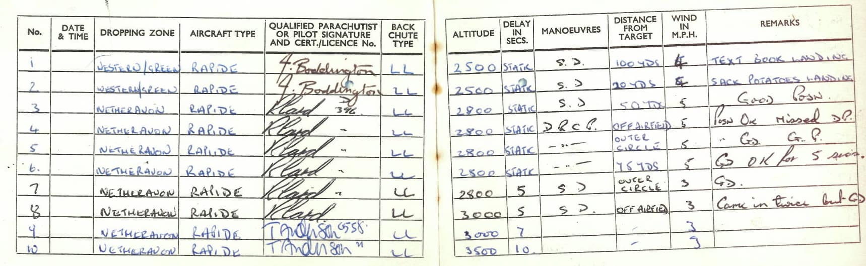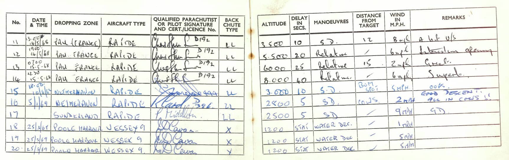 Below are John’s parachuting documents and log books showing 27 jumps over 5 years, including: